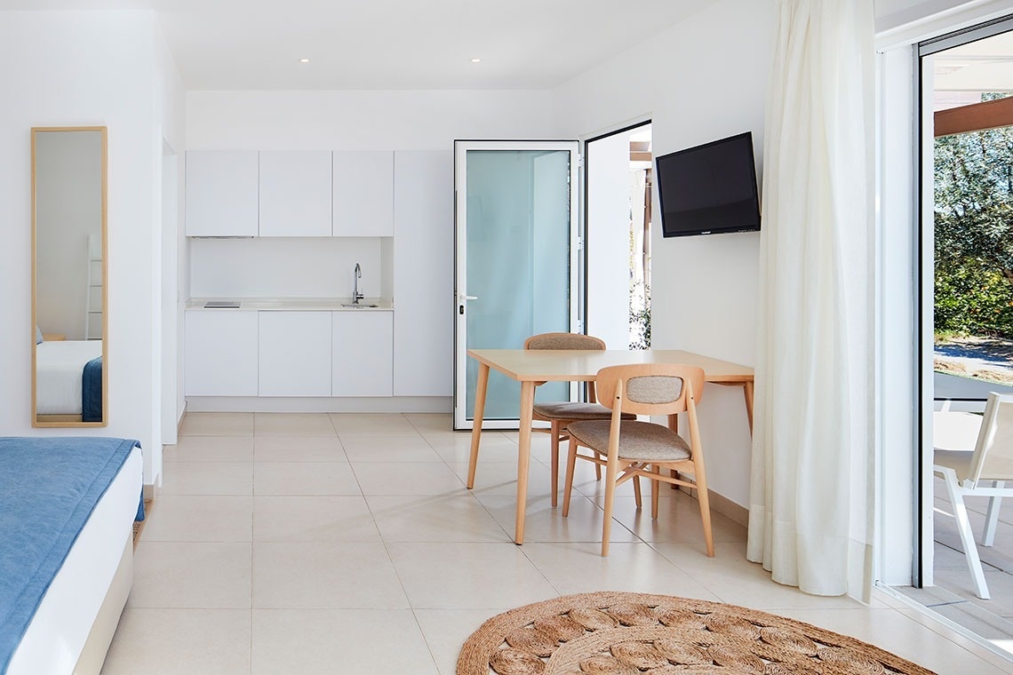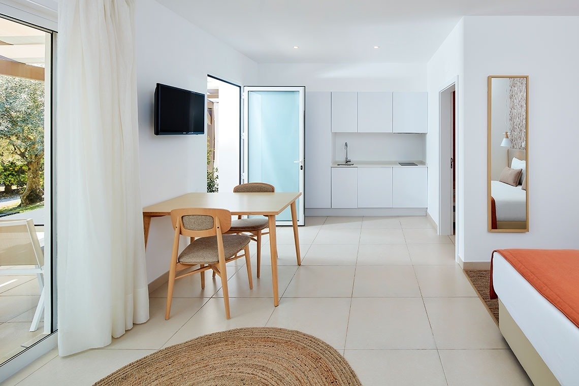 Kitchenette equipada e zona de estar/refeições. Terraço com vista para o laranjal - perfeito para estadias mais longas e autonomia.