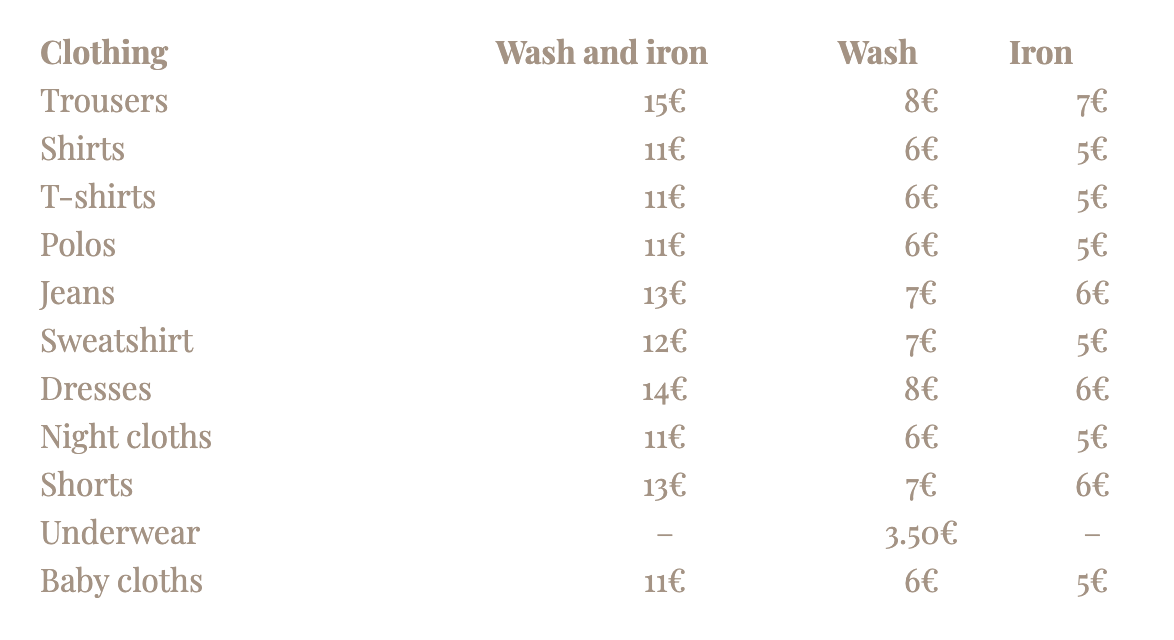 The Hotel is not responsible for clothes that shrink or fade, nor for stains that cannot be removed.